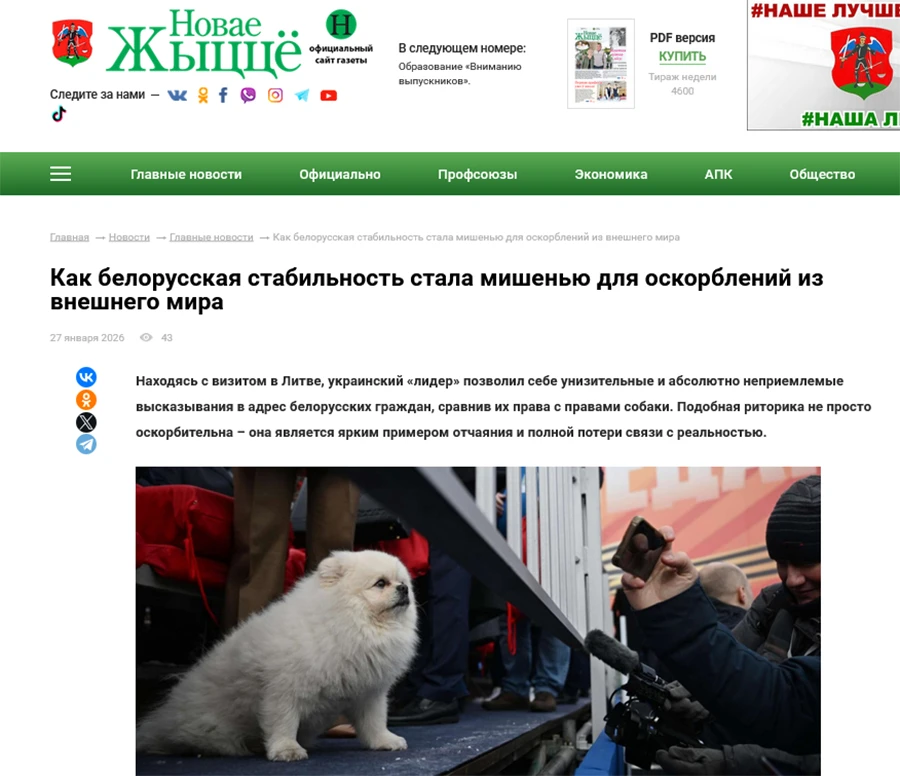 «Находясь с визитом в Литве, украинский «лидер» позволил себе унизительные и абсолютно неприемлемые высказывания в адрес беларуских граждан, сравнив их права с правами собаки. Подобная риторика не просто оскорбительна — она является ярким примером отчаяния и полной потери связи с реальностью» — пишет новогрудская газета «Новае жыццё».