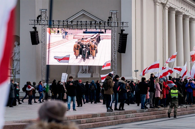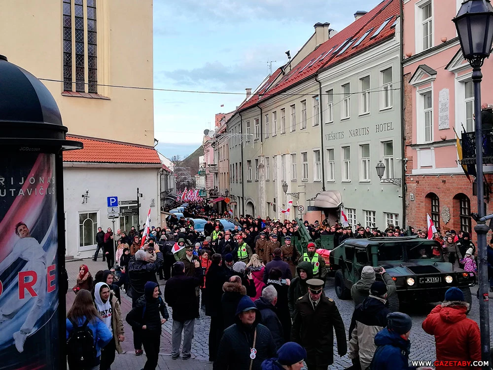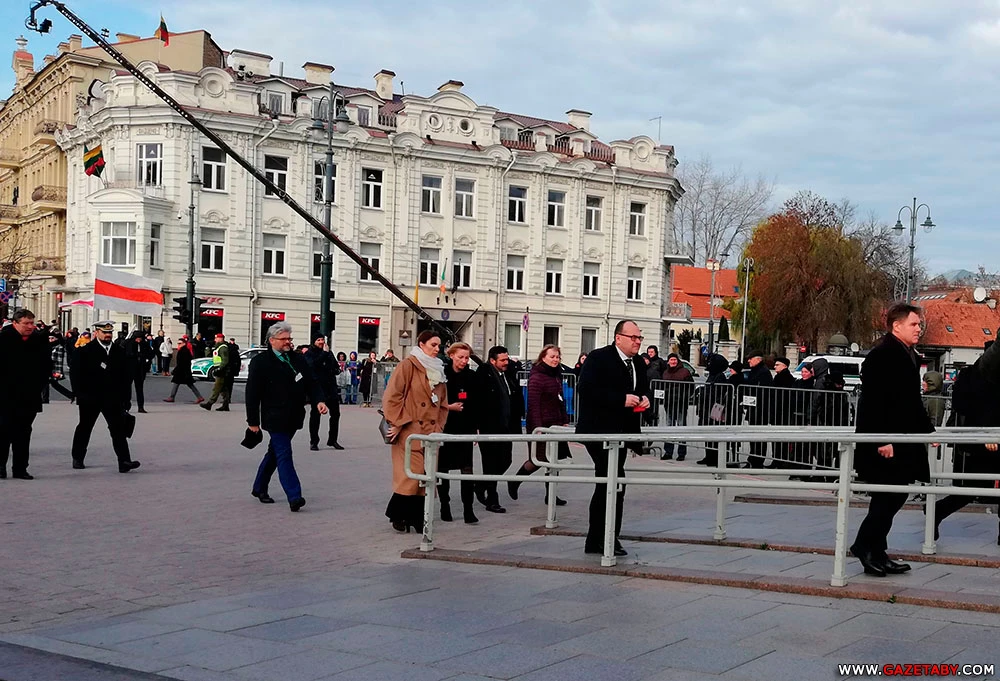 11.40. Як паведамляе карэспандэнт «Салідарнасці», які прыехаў у Вільню сёння раніцай, у цягніку было шмат беларусаў з бел-чырвона-белай сімволікай. На вуліцах Вільні заторы з-за таго, што месца правядзенняў урачыстасцяў перакрылі для прыёму афіцыйных дэлегацый. Да плошчы ідуць групы беларусаў са сцягамі на плячах.