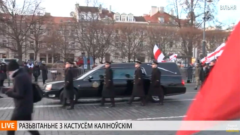 На Кафедральную плошчу прыйшла пешая калона з трунамі паўстанцаў. Сюды арганізавана сцякаюцца групы беларусаў з бел-чырвона-белымі сцягамі.